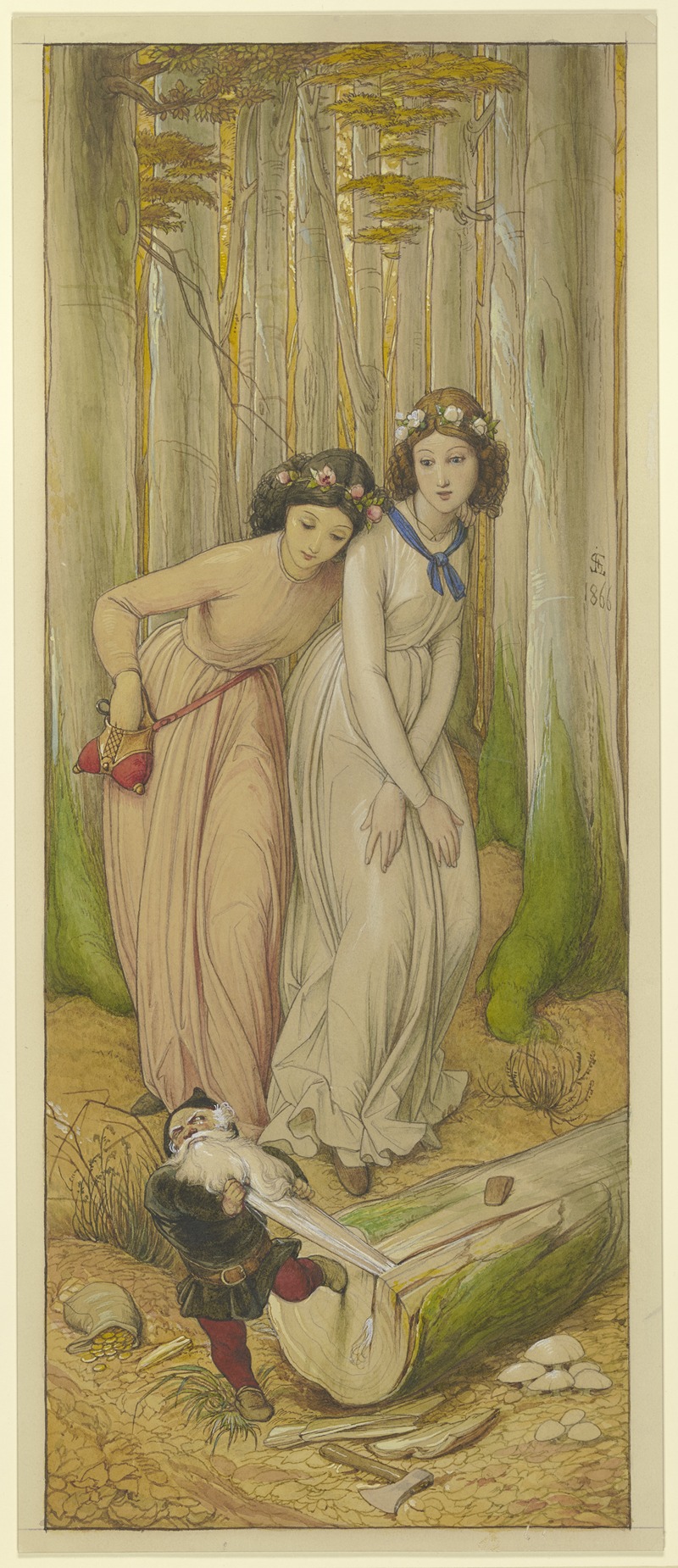 Schneeweißchen und Rosenrot finden im Wald den Zwerg, dessen Bart sich in einem Baumstamm eingeklemmt hat
