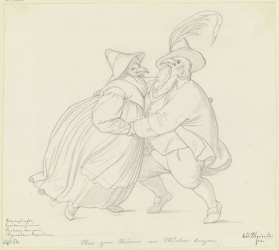 Steinle's involvement with the Nazarene movement, which sought to revive honesty and spirituality in Christian art, influenced his approach to painting. The Nazarenes were known for their detailed and idealized representations, often drawing inspiration from early Renaissance artists. Although "Zwei Kapaune als Steyerisches Bauernpaar tanzend" is a more light-hearted subject compared to Steinle's religious works, it still showcases his meticulous attention to detail and narrative composition.