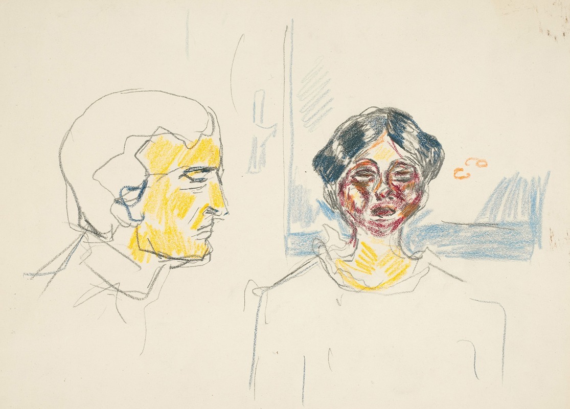 Further details about the painting, including its provenance and exhibition history, are not readily available. As such, "Kvinne og selvportrett i profil" remains a lesser-known but intriguing example of Edvard Munch's artistic exploration of identity, emotion, and human connection.