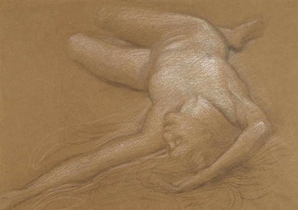 The study depicts a nude female figure in a reclining pose, which was a common subject in academic art of the time, reflecting the influence of classical antiquity. The figure is rendered with careful attention to anatomy and form, showcasing Poynter's skill in drawing and his deep understanding of the human body. This study would have been part of Poynter's process in developing the final composition for "The Cave of the Storm Nymphs," allowing him to explore the pose, lighting, and form of the figures that would populate the final painting.