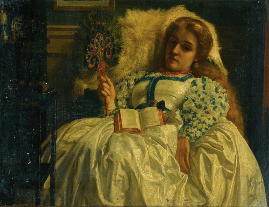 The painting depicts a richly dressed woman holding an ornate peacock fan, a symbol of luxury and exoticism during the Victorian era. The subject is seated in an opulent interior, surrounded by lavish textiles and decorative elements that reflect the Aesthetic Movement's influence, which celebrated beauty and art for art's sake. The use of vibrant colors and intricate patterns in the painting showcases Poynter's skill in rendering textures and his interest in decorative arts.