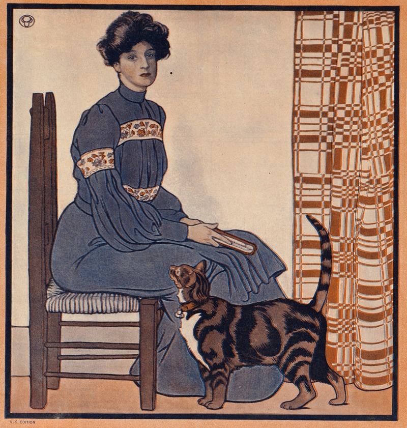 The setting of the illustration reflects the social and cultural context of the time, highlighting the importance of leisure and intellectual pursuits in the lives of middle and upper-class women. The presence of the cat, a common domestic pet, further emphasizes the theme of comfort and tranquility.