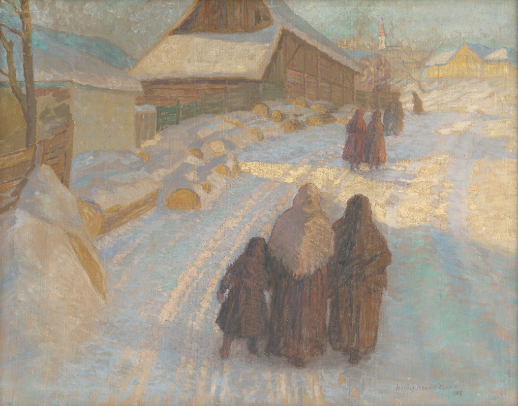 Elemír Halász-Hradil was part of a broader movement of artists in Central Europe who were interested in capturing the everyday lives of ordinary people. His work is often associated with the Hungarian Nagybánya artists' colony, which was known for its plein air painting and focus on naturalism. This influence is evident in "Winter in the Village," where the natural environment plays a central role in the composition.