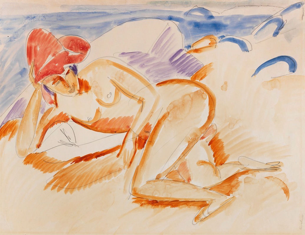 The painting depicts a nude female figure wearing a striking red hat, a juxtaposition that draws attention to the interplay between the figure's vulnerability and the boldness of the accessory. Kirchner's use of vibrant, non-naturalistic colors and dynamic brushstrokes exemplifies the Expressionist style, aiming to convey emotional intensity rather than realistic representation. The red hat serves as a focal point in the composition, contrasting sharply with the more subdued tones of the figure's body and the background.
