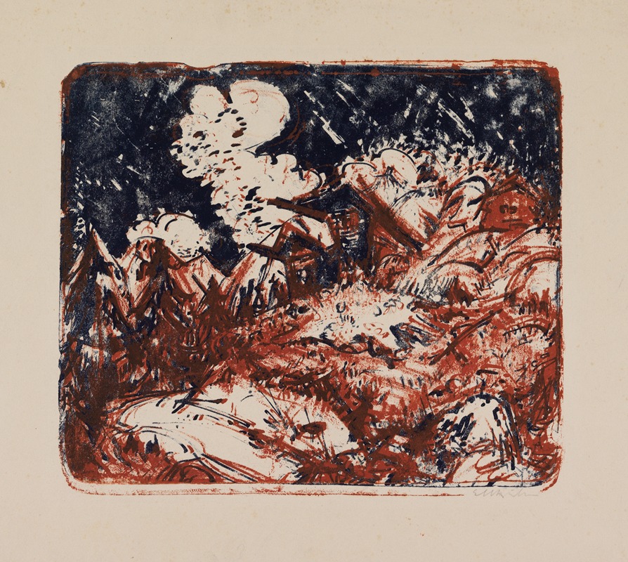 "Alphütten," which translates to "Alpine Huts," is a painting that exemplifies Kirchner's fascination with rural and mountainous landscapes, a theme that became increasingly prominent in his work after he moved to Switzerland in 1917. This relocation was partly due to his health issues and the traumatic experiences he endured during World War I. The Swiss Alps provided Kirchner with a serene and inspiring environment, which significantly influenced his artistic output during this period.