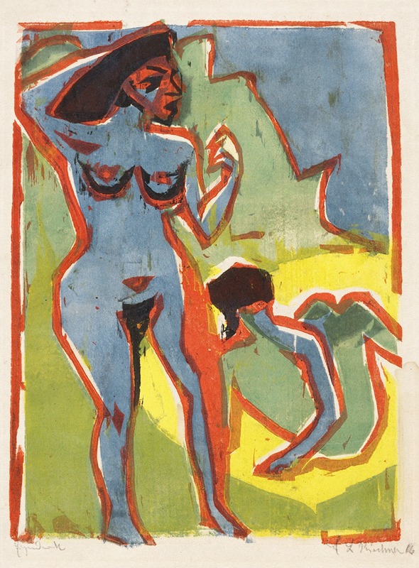 The subject of bathing women was a recurring motif in Kirchner's work, reflecting his interest in themes of nature, freedom, and the human connection to the natural world. These scenes often depicted figures in harmony with their surroundings, emphasizing a sense of liberation and vitality. The depiction of nudes in natural settings was also a way for Kirchner to explore ideas of purity and primal beauty, untainted by the constraints of modern society.
