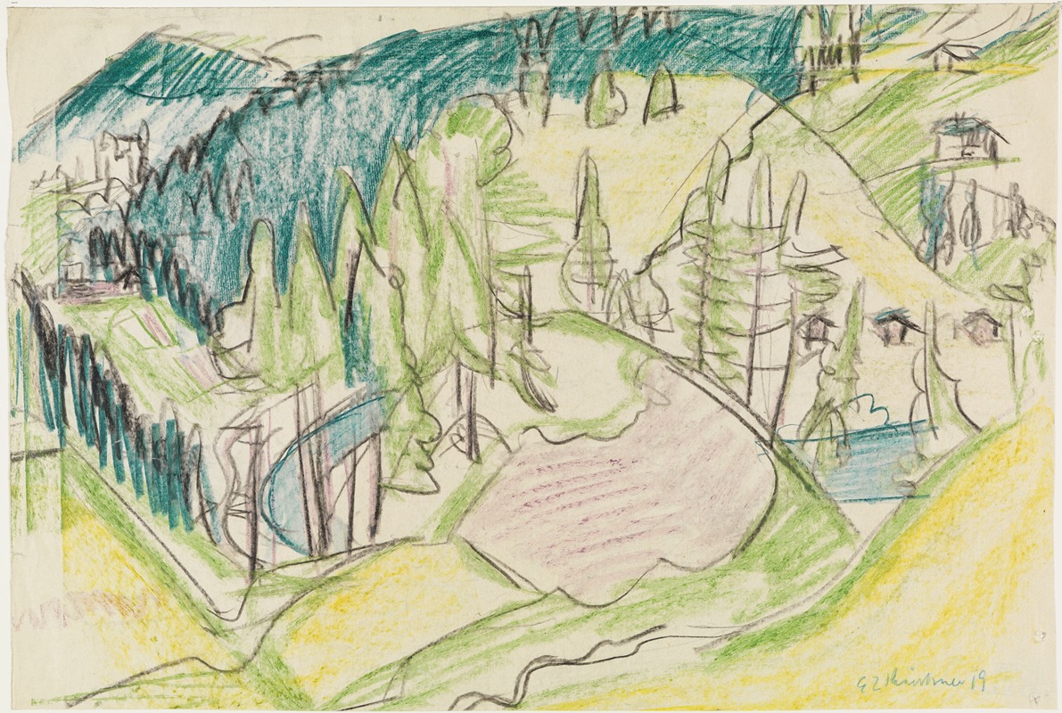 "Berglandschaft mit Tannen" (Mountain Landscape with Firs) is one of Kirchner's notable works, reflecting his deep connection with nature and his interest in the landscapes of the Swiss Alps, where he spent a significant portion of his life. Kirchner moved to Switzerland in 1917, seeking solace and recovery from the psychological trauma he experienced during World War I. The Swiss landscape, particularly the mountainous regions, became a recurring theme in his work during this period.