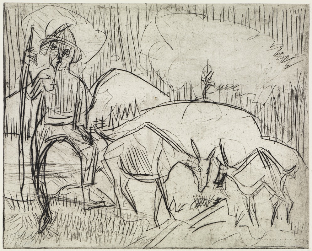 Ernst Ludwig Kirchner's painting Hirt mit Ziegen (Shepherd with Goats) is a work by the German Expressionist artist, who was a founding member of the influential art group Die Brücke (The Bridge). Kirchner, known for his bold use of color and dynamic compositions, played a significant role in the development of modern art in the early 20th century. His works often reflect themes of nature, rural life, and the human figure, rendered in a distinctive, expressive style.