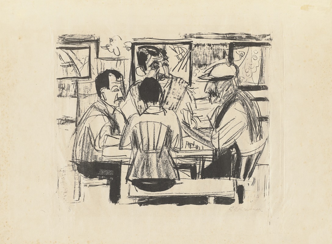 The subject matter of the painting reflects Kirchner's interest in capturing everyday life and the human condition. By focusing on a simple, yet universally relatable activity like playing cards, Kirchner is able to convey a sense of camaraderie and shared experience among the figures. This theme of communal interaction is a recurring motif in Kirchner's work, as he often sought to depict the social and emotional connections between people.