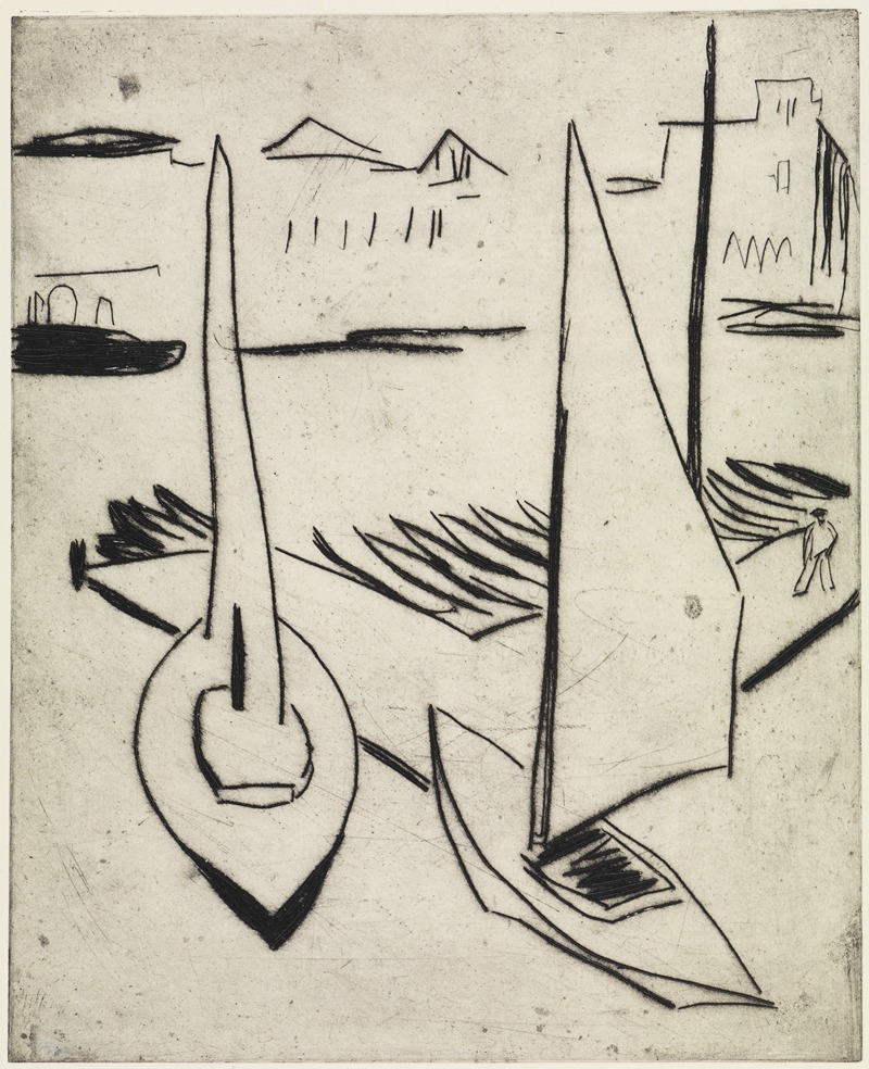 "Segelboothafen an der Alster, Hamburg" is one of Kirchner's paintings that captures the essence of a bustling harbor scene. The Alster is a river in Hamburg, Germany, known for its picturesque views and vibrant activity. While specific details about this particular painting are scarce, it is consistent with Kirchner's style during his time with Die Brücke, where he often depicted scenes of modern life, including urban landscapes, street scenes, and leisure activities.