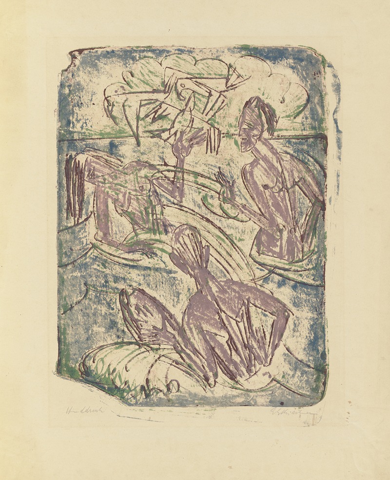 "Spritzende Badende" (Splashing Bathers) is a painting by the German expressionist artist Ernst Ludwig Kirchner, created in 1910. Kirchner was a founding member of the influential art group Die Brücke (The Bridge), which played a crucial role in the development of Expressionism in the early 20th century. This movement sought to convey emotional experience rather than physical reality, often through bold colors and dynamic compositions.