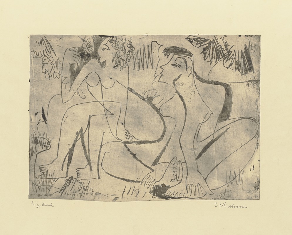 The artwork depicts two young women seated outdoors, surrounded by a natural setting. The figures are rendered in a simplified and angular manner, a hallmark of Kirchner's approach to form. The vibrant palette and energetic brushstrokes convey a sense of vitality and connection to nature, themes often explored in Kirchner's work. The outdoor setting and casual poses of the figures suggest a moment of leisure and intimacy, aligning with the ideals of Die Brücke, which sought to break away from academic traditions and embrace a more spontaneous and direct engagement with life and art.