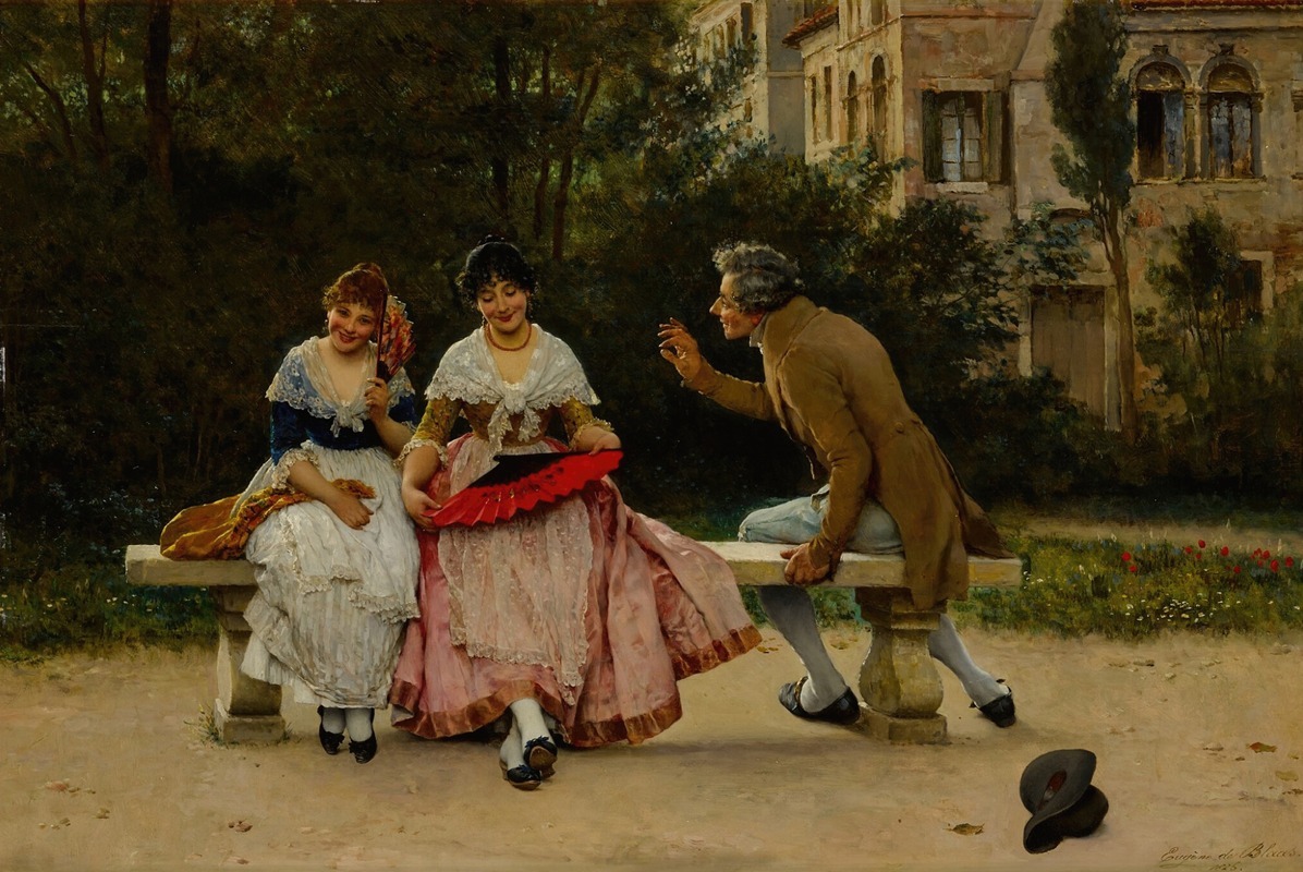 Eugen von Blaas, an Austrian painter known for his genre scenes and portraits, created the painting "In the Park" during the late 19th or early 20th century. Von Blaas was born on July 24, 1843, in Albano Laziale, Italy, and was the son of Karl von Blaas, a noted historical painter. Eugen von Blaas became renowned for his depictions of Venetian life, often capturing the everyday activities and social interactions of people with a keen eye for detail and a vibrant palette.