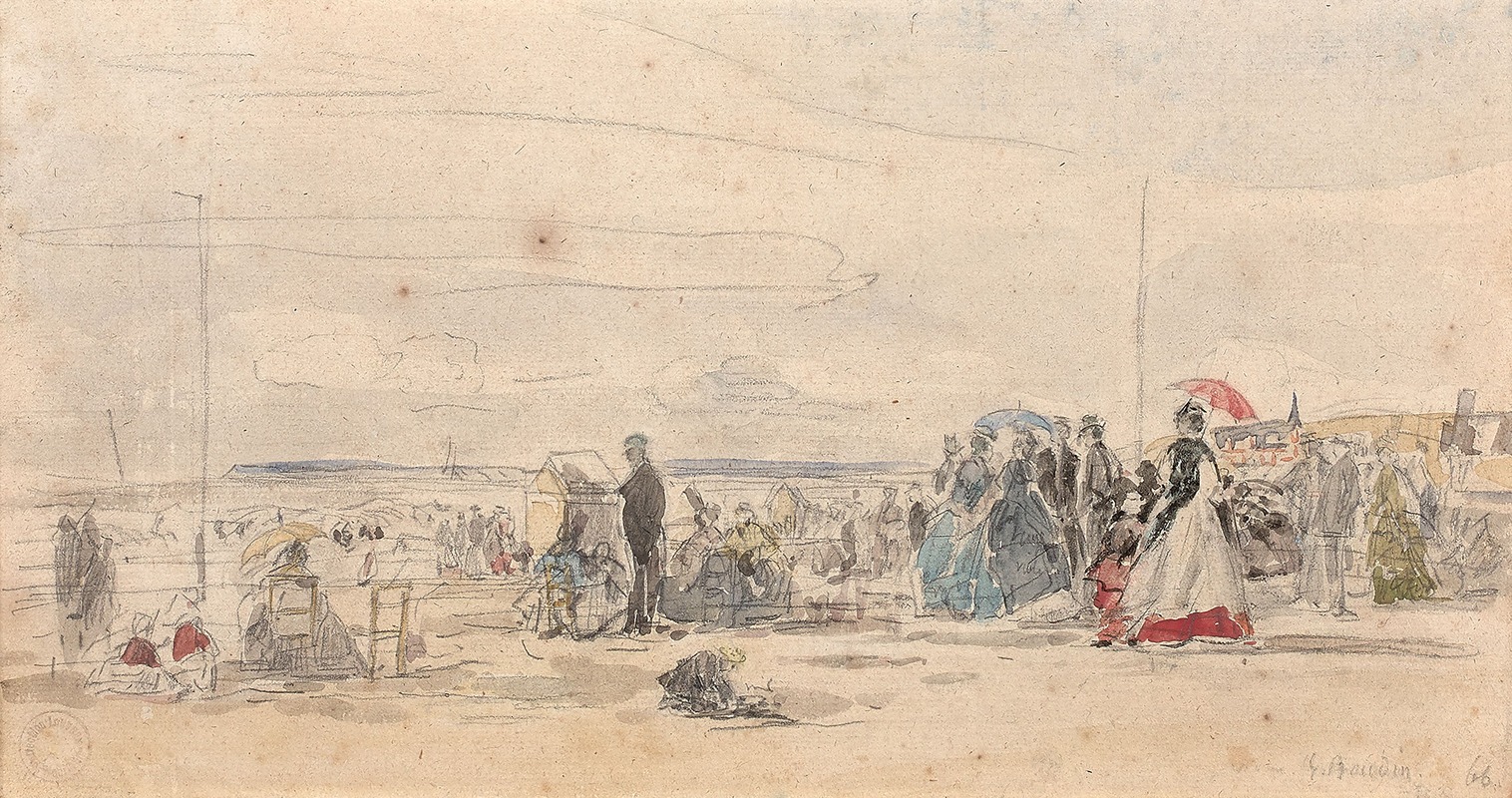 The painting portrays a beach scene in Deauville, a fashionable seaside resort in Normandy, France, which became a popular destination for the French upper class during the 19th century. Deauville's beaches, with their elegant promenades and vibrant social life, provided Boudin with ample inspiration for his work. In this painting, Boudin depicts a group of figures, likely vacationers, enjoying the seaside. The composition reflects his characteristic style, with a focus on the expansive sky dominating the scene, a hallmark of his oeuvre. The figures are rendered with loose, fluid brushstrokes, emphasizing the fleeting nature of the moment rather than precise detail.