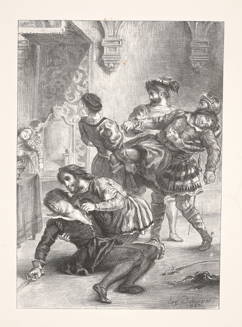 Eugène Delacroix, a prominent French Romantic artist, is renowned for his expressive brushwork and vibrant use of color. One of his notable works is "The Death of Hamlet," which captures a dramatic moment from William Shakespeare's famous tragedy, "Hamlet." Delacroix's interpretation of this scene reflects his deep engagement with literary themes and his ability to convey intense emotion through his art.