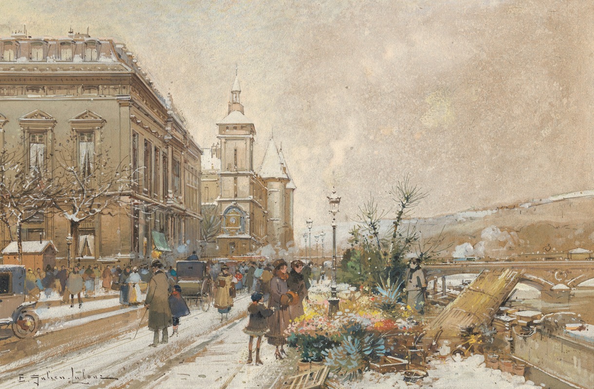 One of his notable works, "Le Marché aux fleurs," exemplifies his skill in portraying the lively and picturesque scenes of Paris. Although specific details about this particular painting are limited, it is consistent with Galien-Laloue's broader oeuvre, which often features market scenes, streets, and the everyday life of Parisians. His paintings typically include elements such as horse-drawn carriages, elegantly dressed figures, and the iconic architecture of Paris, all rendered with a delicate touch that brings the scene to life.