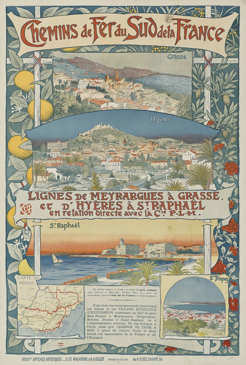 This particular piece, "Chemins de fer du Sud de la France… Lignes de Meyrargues à Grasse," is a poster that was designed to promote the railway lines from Meyrargues to Grasse in the south of France. The artwork is a fine example of Grasset's style, which often featured intricate designs and a harmonious blend of colors.