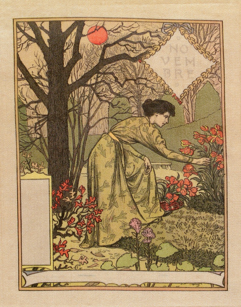 The exact medium of Novembre is not definitively documented, but Grasset often worked in lithography and other printmaking techniques, which were widely used for decorative panels and illustrations during this era. His works were frequently reproduced and distributed, making them accessible to a broader audience and contributing to the dissemination of Art Nouveau aesthetics.