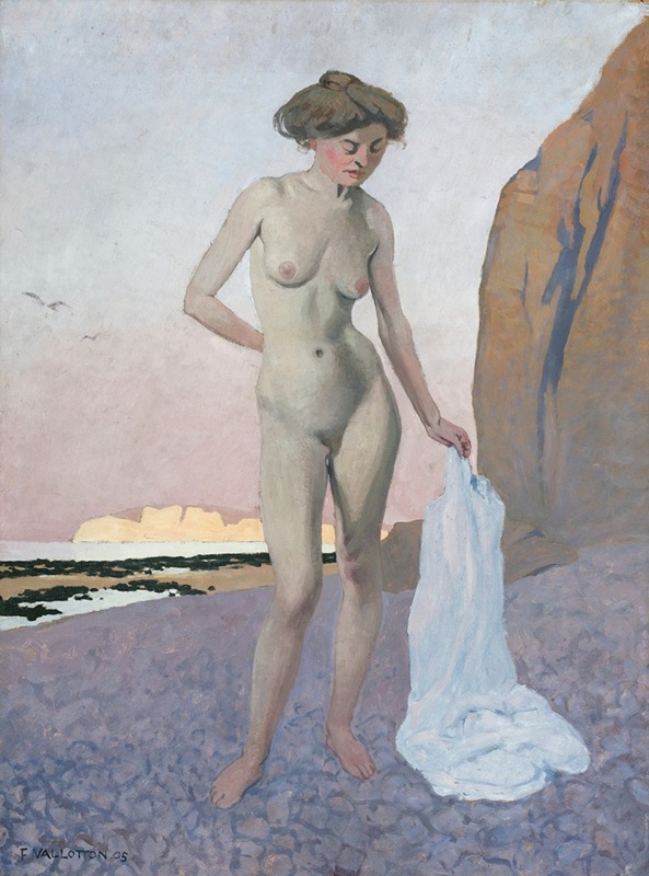 "On The Beach" (French: "Sur la plage") is a painting created in 1905 by the Swiss-French artist Félix Vallotton. Vallotton was a prominent member of the Nabis group, a post-Impressionist avant-garde movement that included artists like Pierre Bonnard and Édouard Vuillard. Known for his distinctive style that combined elements of realism and symbolism, Vallotton's work often explored themes of intimacy, domesticity, and the human figure within landscapes.