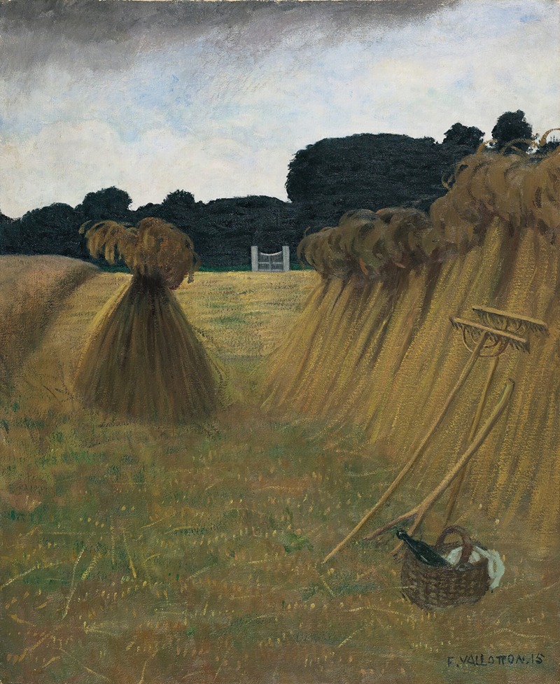 "The Sheaves" is a landscape painting that captures the essence of rural life through the depiction of harvested wheat sheaves. Vallotton's approach to this subject matter is characterized by his use of bold colors and simplified forms, which are hallmarks of his style. The painting reflects Vallotton's interest in the interplay between light and shadow, as well as his ability to convey a sense of tranquility and timelessness in his landscapes.