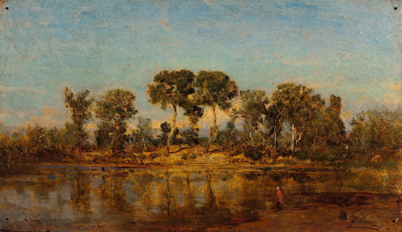 Félix Ziem's painting Le Rhône Entre Arles Et Avignon (translated as The Rhône Between Arles and Avignon) is a work by the French artist Félix Ziem, who is widely recognized for his contributions to 19th-century landscape painting. Ziem was associated with the Barbizon School and is known for his vibrant depictions of nature, particularly scenes of Venice, the Mediterranean, and French landscapes.