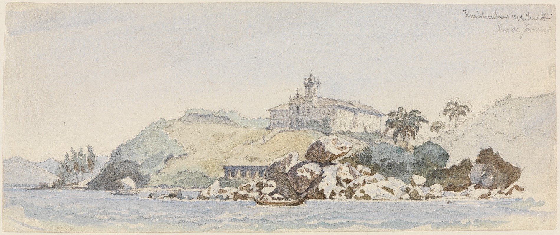 This particular painting, whose title translates to "The ‘Ilha do buon Jesus’ near Rio de Janeiro," portrays a scene associated with the Ilha do Bom Jesus, an island located in the Guanabara Bay near Rio de Janeiro, Brazil. The island, historically significant for its role during the colonial period, was a site of Portuguese settlement and activity. Keller's depiction likely captures the natural beauty and historical ambiance of the location, consistent with his interest in combining landscape with historical narrative.