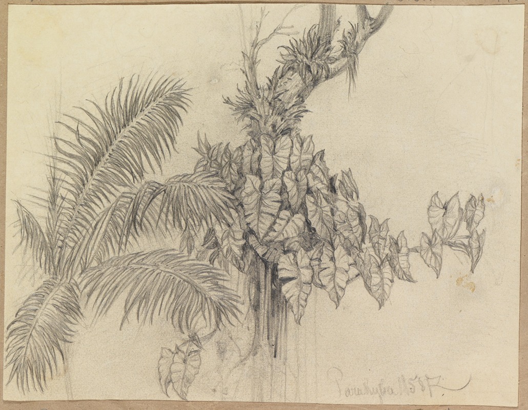 Zwei Pflanzenstudien; Palme und Schlingengewächs mit Kakteen an einem Ast