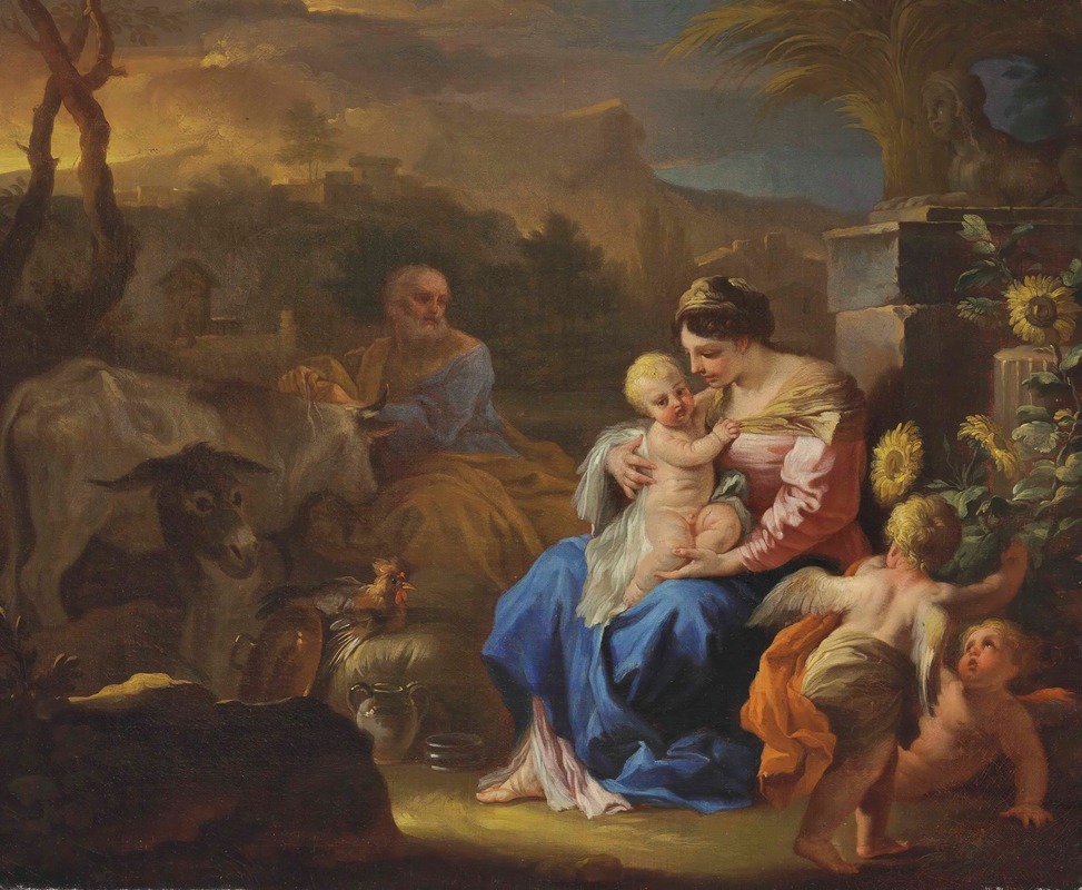 "The Rest on the Flight into Egypt" depicts a moment from the New Testament, where the Holy Family pauses during their escape to Egypt. This journey was undertaken to flee King Herod's massacre of the innocents, as described in the Gospel of Matthew. The painting typically portrays the Virgin Mary, the infant Jesus, and Saint Joseph, often accompanied by angels or other symbolic figures, resting in a serene landscape. Solimena's interpretation of this scene would have been influenced by the artistic trends of his time, as well as the religious and cultural context of 17th-century Italy.