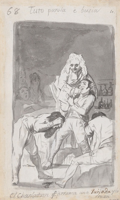 "A Charlatan Extracting a Tooth from a Patient’s Mouth, Figure in the Foreground Vomiting" is a painting by the renowned Spanish artist Francisco de Goya. This artwork is part of Goya's series of paintings that depict scenes of everyday life with a critical and often satirical eye. Goya, who lived from 1746 to 1828, is known for his profound influence on both the Romantic and modern art movements.