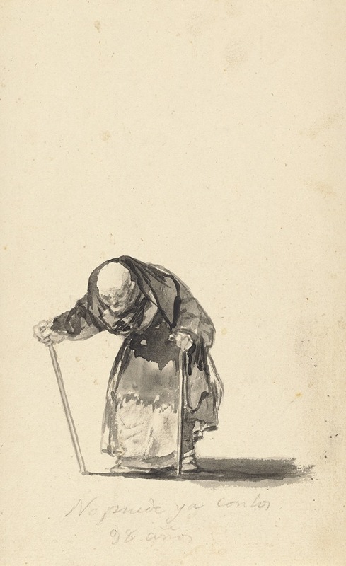"He Can No Longer at the Age of Ninety-Eight" depicts an elderly man, hunched over and frail, struggling to walk with the aid of two canes. The figure's face is marked by deep lines and an expression of exhaustion, capturing the physical and emotional toll of old age. The drawing's title, inscribed by Goya himself, underscores the man's advanced age and his inability to continue with the vigor of his youth.