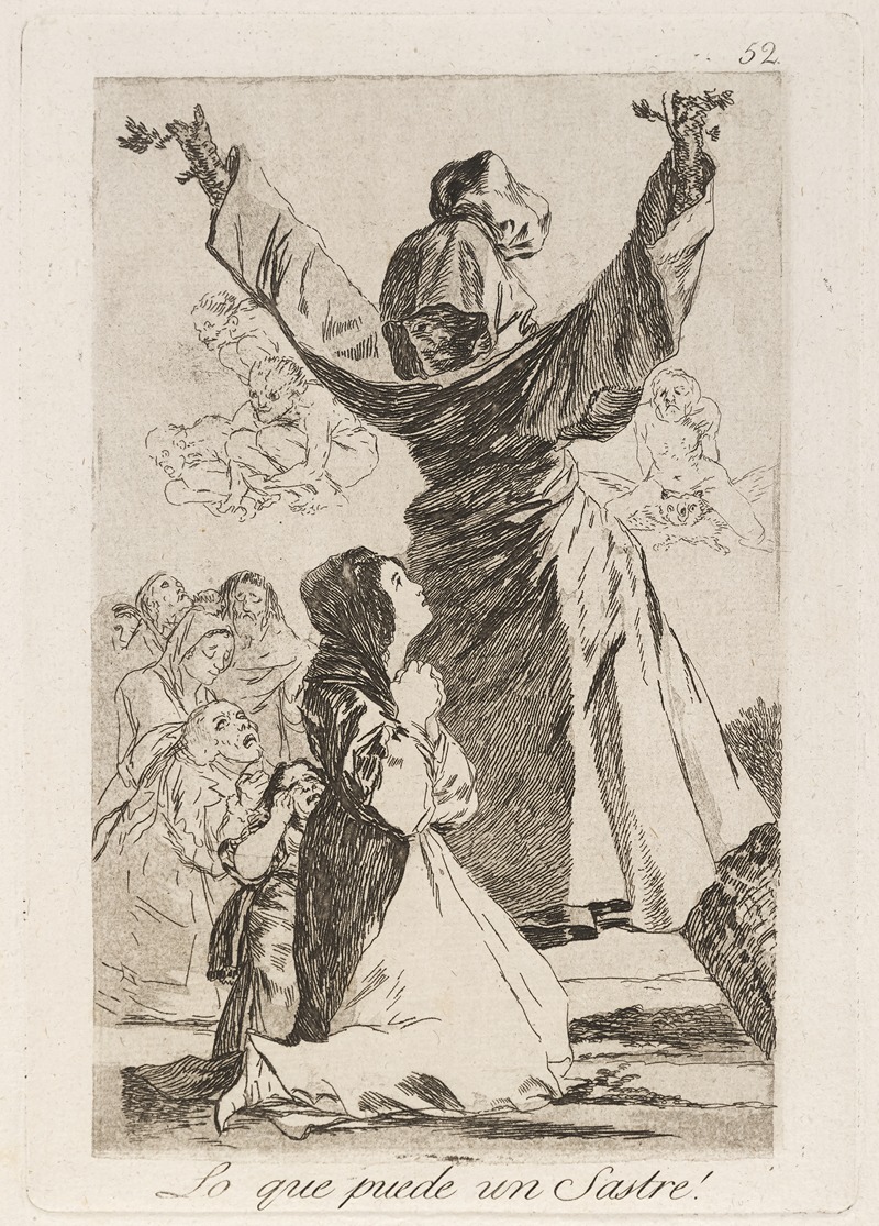 Francisco de Goya (1746-1828) is considered one of the most important Spanish artists of the late 18th and early 19th centuries. His work spans a wide range of subjects, from portraits of the Spanish royal family to deeply personal and often disturbing depictions of war and human suffering. Goya's "Los Caprichos" series, including "Lo que puede un sastre!," is particularly significant for its innovative use of printmaking techniques and its bold social commentary.