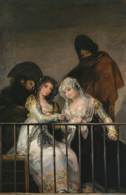 Majas on a Balcony is a painting attributed to the Spanish artist Francisco de Goya, created in the early 19th century. The artwork depicts two young women, known as "majas," dressed in traditional Spanish attire, seated on a balcony. They are accompanied by two shadowy male figures standing behind them, whose presence adds an air of mystery and intrigue to the scene. The painting is notable for its dramatic use of light and shadow, a hallmark of Goya's style, which enhances the contrast between the brightly lit figures of the women and the darker, more ambiguous forms of the men.