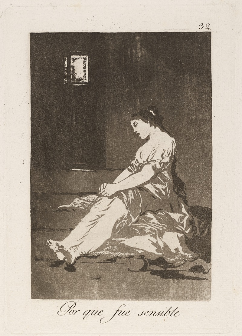 Francisco de Goya's Por que fue sensible (translated as "Because she was sensitive") is one of the 80 etchings that comprise his famous series Los Caprichos, published in 1799. Los Caprichos is a collection of satirical and allegorical prints that critique the social, political, and religious issues of late 18th-century Spain. The series reflects Goya's disillusionment with societal norms, human folly, and the abuses of power.