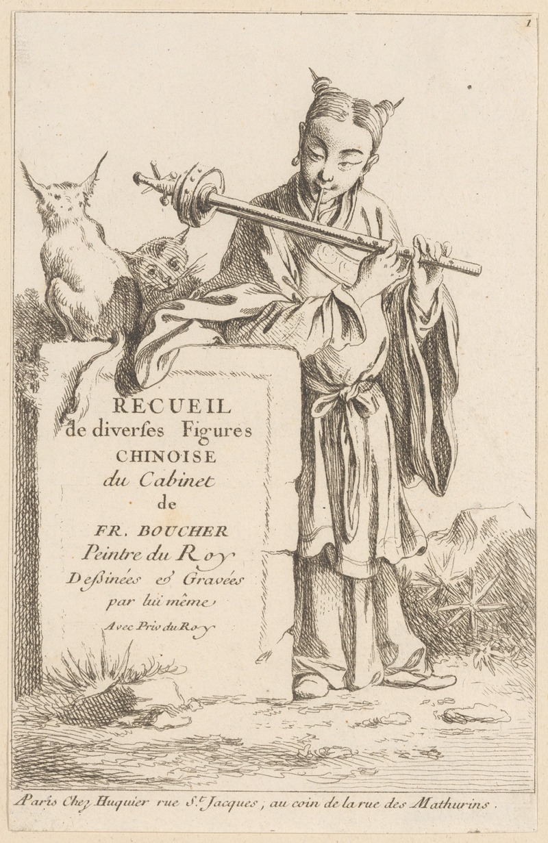 Boucher's engagement with Chinoiserie can be seen as part of this broader cultural phenomenon. His work often included fantastical interpretations of Chinese themes, which were more reflective of European tastes and imaginations than of authentic Chinese culture. The "Collection of Diverse Chinese Figures – Title Page" likely served as an introduction to a series or collection of prints or illustrations that depicted various Chinese figures, possibly intended for decorative purposes or as a form of artistic exploration.