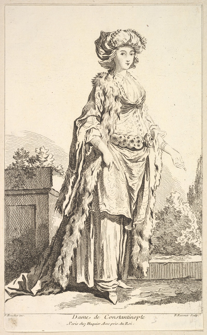 The series to which "Dame de Constantinople" belongs was part of a broader trend in 18th-century Europe where artists and designers produced works that depicted various national and historical costumes. These works were not only artistic endeavors but also served as a form of documentation and a source of inspiration for fashion and decorative arts of the period. Boucher's engravings were often used as references for textile designs, wallpapers, and other decorative objects.