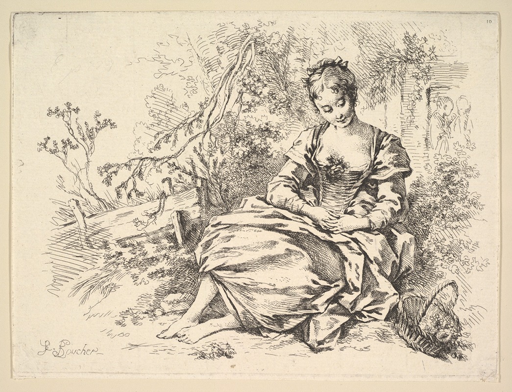 Boucher was born in Paris in 1703 and became one of the most celebrated artists of his time. He was a favorite of Madame de Pompadour, the influential mistress of King Louis XV, and his work was highly sought after by the French aristocracy. Boucher's art is noted for its light-heartedness, use of soft colors, and intricate details, all of which are evident in "Girl in a Landscape with a Basket of Flowers."