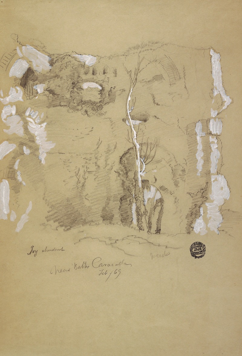 The painting "Landscape near the Baths of Caracalla, Rome" was created during a period when Church was deeply influenced by his travels in Europe and the Middle East. The Baths of Caracalla, located in Rome, are one of the most famous ancient Roman public baths and a significant architectural landmark. Built between AD 212 and 216 during the reign of Emperor Caracalla, these baths were among the largest and most impressive of their kind, showcasing the grandeur of Roman engineering and architecture.