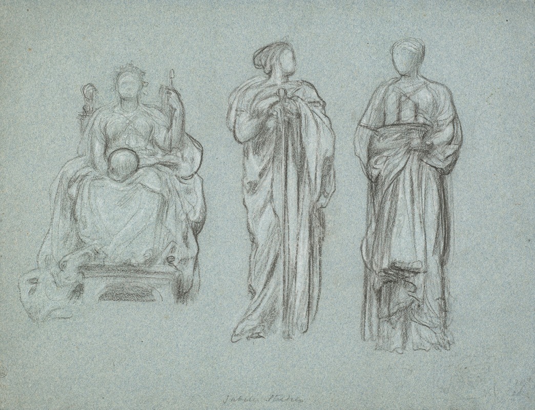 In summary, "Three Studies of Draped Female Figures, One Seated" is a testament to Frederic Leighton's artistic prowess and his dedication to classical ideals. The piece reflects his ability to blend technical skill with a deep appreciation for the beauty of the human form, making it a significant work within his oeuvre and the broader context of 19th-century academic art.