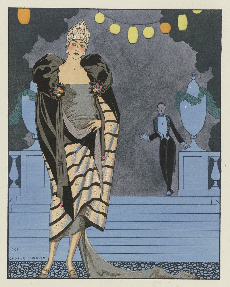 In summary, Evening Attire by George Barbier is a striking example of early 20th-century fashion illustration, reflecting the opulence and sophistication of the Art Deco period. Barbier's work, characterized by its intricate details and rich colors, has left a lasting impact on the world of fashion and illustration, making him a revered figure in the history of art.