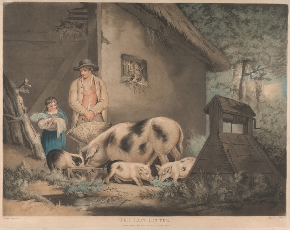Morland's work is characterized by its naturalistic style and attention to detail. He had a unique ability to capture the textures of fur and feathers, as well as the play of light and shadow in outdoor settings. This made his animal paintings particularly popular during his lifetime. "The Last Litter" likely features a scene involving animals, possibly pigs or dogs, as these were common subjects in his oeuvre.