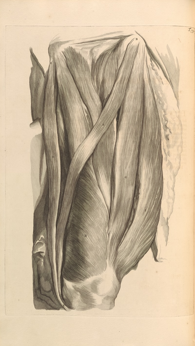 Anatomia humani corporis Pl.076 is an anatomical illustration created by Gerard de Lairesse, a prominent Dutch Golden Age artist and illustrator. This work is part of the larger collection of anatomical plates featured in the book Anatomia Humani Corporis (1685), authored by the Dutch anatomist Govard Bidloo. The book is considered a significant contribution to the field of anatomy during the late 17th century.