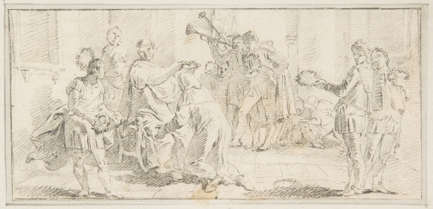 Tiepolo's ability to blend allegory with historical and contemporary themes made his work highly sought after by patrons across Europe. His paintings were commissioned for palaces, churches, and public buildings, where they were intended to impress viewers with their scale and intricate detail. The "Allegorical Scene of Coronation" would likely have been created for a similar purpose, possibly to celebrate a specific event or to honor a particular individual or institution.