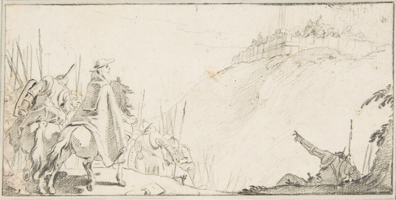 In summary, "Cardinal with Troops Facing a Fortification on a Hilltop" is a testament to Giovanni Battista Tiepolo's artistic prowess and his ability to convey complex narratives through his paintings. The work exemplifies his signature style, characterized by dynamic compositions, dramatic use of light, and a sophisticated understanding of color and perspective.