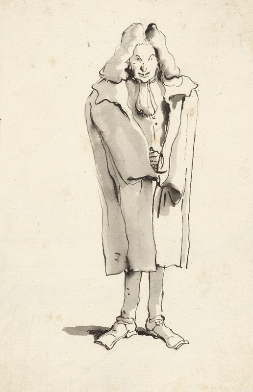 Giovanni Battista Tiepolo, an Italian painter and printmaker, is renowned for his significant contributions to the art world during the 18th century. Known for his frescoes and etchings, Tiepolo's work is characterized by its vibrant color, dynamic compositions, and dramatic use of light and shadow. Among his many works, "Caricature of a Man Wearing an Overcoat" stands out as a notable example of his skill in caricature, a genre that allows for exaggerated depictions of its subjects.