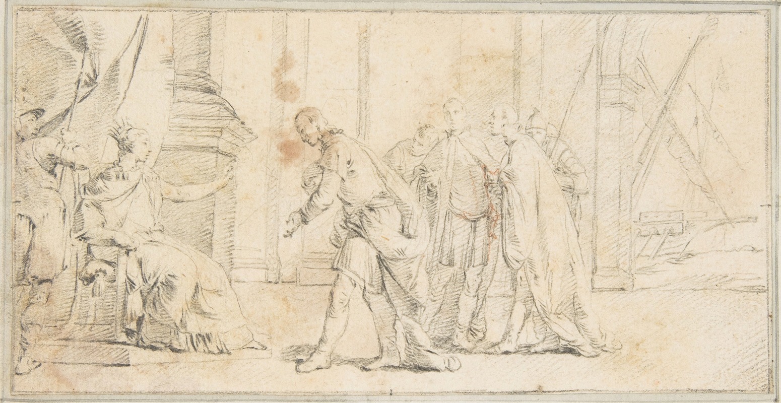 "Queen of Port City Receiving Envoys" is a testament to Tiepolo's skill in portraying elaborate scenes with numerous figures. The painting likely depicts a historical or allegorical event, showcasing a queen or noblewoman in a port city setting, surrounded by envoys or ambassadors. The composition is filled with movement and energy, typical of Tiepolo's style, with figures engaged in animated gestures and interactions.