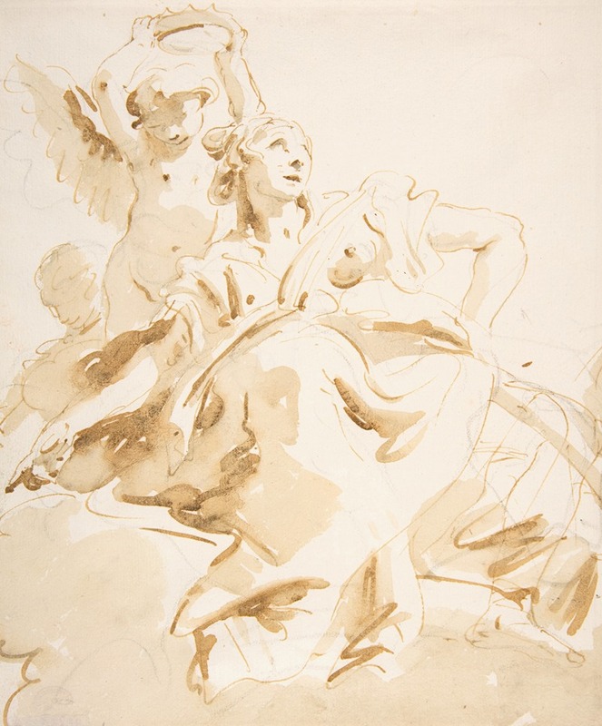 The composition is marked by Tiepolo's typical use of soft, flowing lines and a harmonious color scheme. The figures are rendered with a sense of grace and fluidity, their forms illuminated by a gentle, diffused light that enhances the ethereal quality of the scene. Tiepolo's ability to convey texture and movement through his brushwork is evident in the delicate rendering of the putto's wings and the woman's drapery.