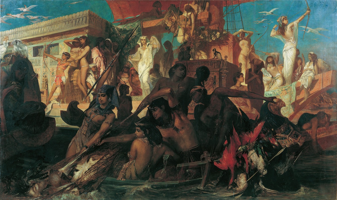 Hans Makart's painting The Nile Hunt is a notable work by the Austrian artist, who was a prominent figure of the 19th-century academic art movement. Makart, known for his grandiose and theatrical style, often created works that celebrated historical, mythological, and exotic themes. The Nile Hunt reflects his fascination with opulent and dramatic compositions, as well as his ability to depict dynamic scenes filled with movement and vivid detail.