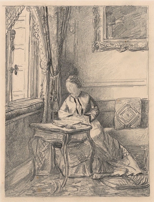 The painting portrays a woman seated near a window, absorbed in her thoughts or perhaps observing the world outside. The composition emphasizes the interplay of light and shadow, a hallmark of de Braekeleer’s style. Sunlight filters through the window, illuminating parts of the room and creating a serene yet contemplative atmosphere. The woman’s posture and the surrounding details suggest a moment of stillness and introspection, inviting viewers to reflect on the quiet beauty of ordinary life.