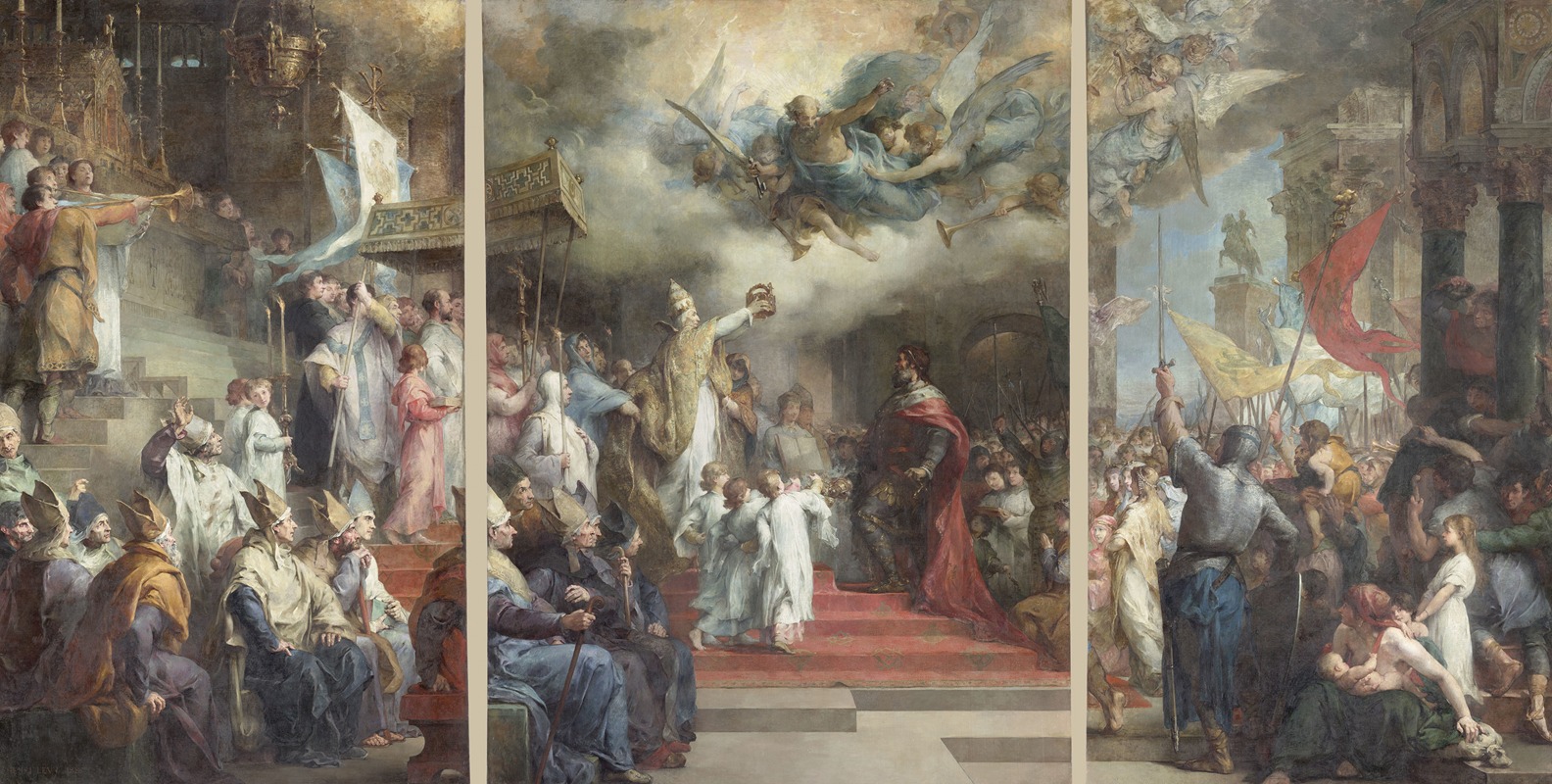 Henri Léopold Lévy was a French painter known for his historical and religious compositions. One of his notable works is "Le Couronnement de Charlemagne" (The Coronation of Charlemagne), which captures the momentous event of Charlemagne's coronation as Emperor of the Romans. This painting is a representation of a significant historical event that took place on December 25, 800 AD, when Charlemagne was crowned by Pope Leo III at St. Peter's Basilica in Rome.