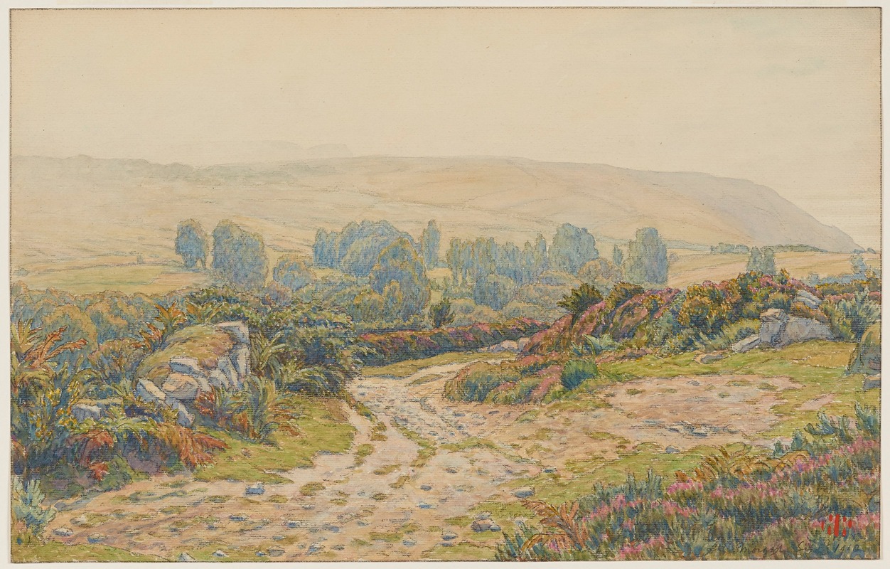 Rivière's work is also noted for its compositional balance and attention to detail. In "Brume et rosée," the composition likely guides the viewer's eye through the landscape, inviting them to explore the nuances of the scene. The moors of Pors Léonnec, with their undulating forms and rich textures, provide a perfect subject for Rivière's exploration of light and shadow.